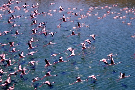 Flamingos taking flight, Ngorongoro Crater, Tanznia