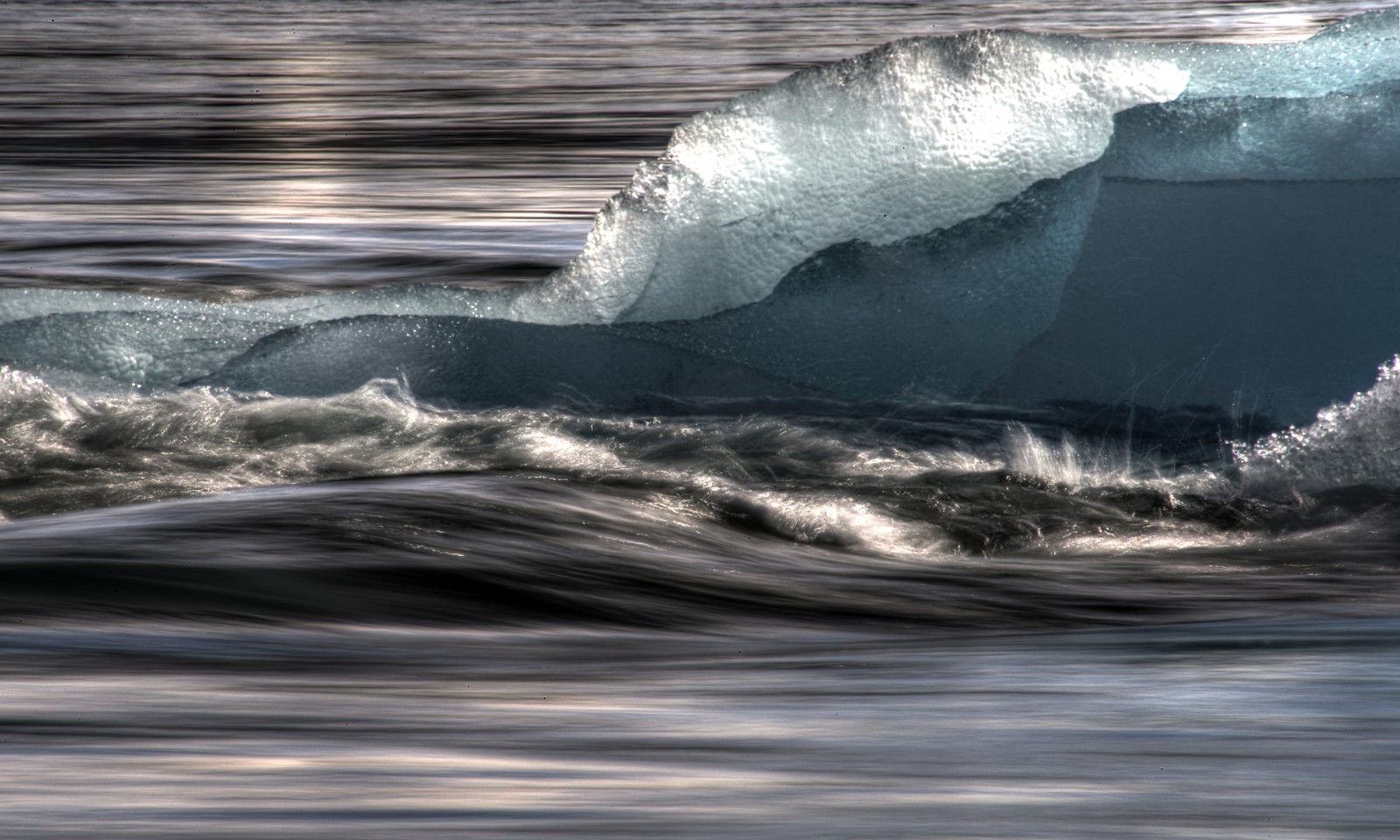 In the south of Iceland is a lagoon where glaciers from the vast central ice cap spill their ancient ice. The mammoth bergs melt and roll in the lagoon until they are small enough to wash through its shallow black-sand mouth into the ocean. I watched this piece float and roll until it grounded and held fast against the flow, creating its own swirls and standing waves. The ancient ice contains very few air bubbles or impurities, so it gives off an otherworldly transparent blue glow. This was an HDR composite shot, which allowed me to get the blurred movement of the water and its crisp spray together in one shot.